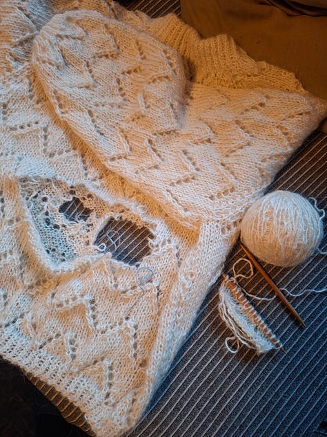 What a poignant opening! My partner and I live very close to where a white supremacist rally was scheduled yesterday, and we did some garment dyeing to give ourselves a project to focus on. In addition to dyeing some garments, I’ve been working the past week on crocheting chains to embellish a little-worn sweater with. Wishing everyone a safe winter and happy caring and repairing!