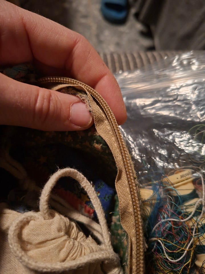 Sewed the zipper tape down on the inside of the bag I’ve used for mending supplies with a consistently stuck zipper for the past 6 years (mending supplies LIVE in this bag. I do not know why it hadn’t previously occurred to me to fix it after fighting the zipper tape out of the teeth for the umpteenth time)